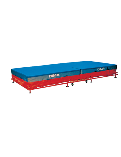 Sautoir positionné sur un caillebotis repliable. Sécurité totale grâce à un système de ressorts compensateurs permettant de manipuler le sautoir sans effort et en toute sécurité. Pliure renforcée par des sangles polyamide. Déplacement facile grâce à 2 roues fixes et 2 roues omnidirectionnelles et autobloquantes. Peut se ranger contre un mur ou dans un espace réduit. Housse tergal 1000 deniers classée Non Feu M2. Pieds munis de patins en caoutchouc pour protéger les sols. Poignées de manutention cousues 8 piqûres. Garantie : 5 ans. Existe en 3 dimensions : 400 x 200 x 50 cm, replié : 215 x 200 x 125 cm ; 400 x 200 x 60 cm, replié : 215 x 200 x 145 cm ; 450 x 250 x 60 cm, replié : 240 x 250 x 145 cm.