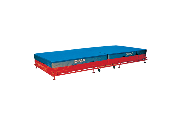 Sautoir positionné sur un caillebotis repliable. Sécurité totale grâce à un système de ressorts compensateurs permettant de manipuler le sautoir sans effort et en toute sécurité. Pliure renforcée par des sangles polyamide. Déplacement facile grâce à 2 roues fixes et 2 roues omnidirectionnelles et autobloquantes. Peut se ranger contre un mur ou dans un espace réduit. Housse tergal 1000 deniers NF classée au feu M2. Pieds munis de patins en caoutchouc pour protéger les sols. Poignées de manutention cousues 8 piqûres. Garantie : 5 ans. Existe en 3 dimensions : 400 x 200 x 50 cm, replié : 215 x 200 x 125 cm ; 400 x 200 x 60 cm, replié : 215 x 200 x 145 cm ; 450 x 250 x 60 cm, replié : 240 x 250 x 145 cm.