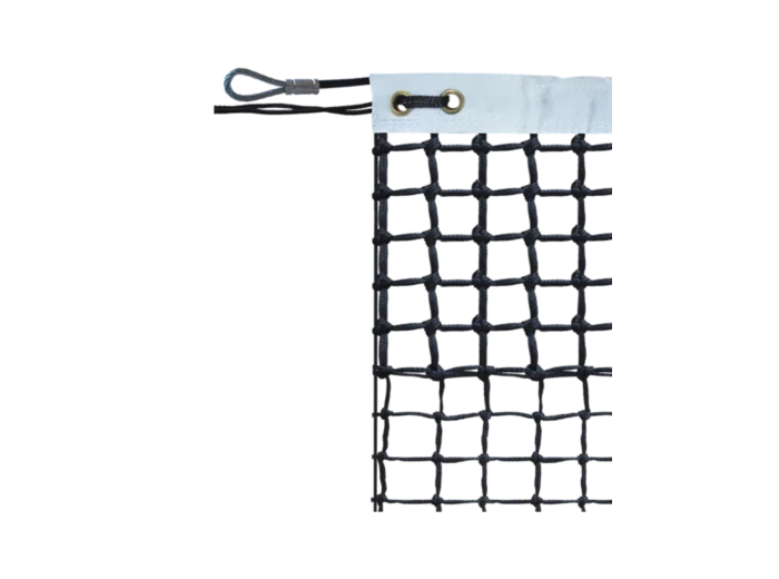 Filet de tenni, dimensions : 12,70 x 1,07 m. Tressé PE* avec nœuds. 6 rangées de MAILLE DOUBLE 45 mm. Diamètre du fil : 3mm. Coloris : noir. Polyester (PES) 110 mm blanc avec 4 surpiqûres. Câble acier gaîné Ø6mm en haut et cordeau en bas.