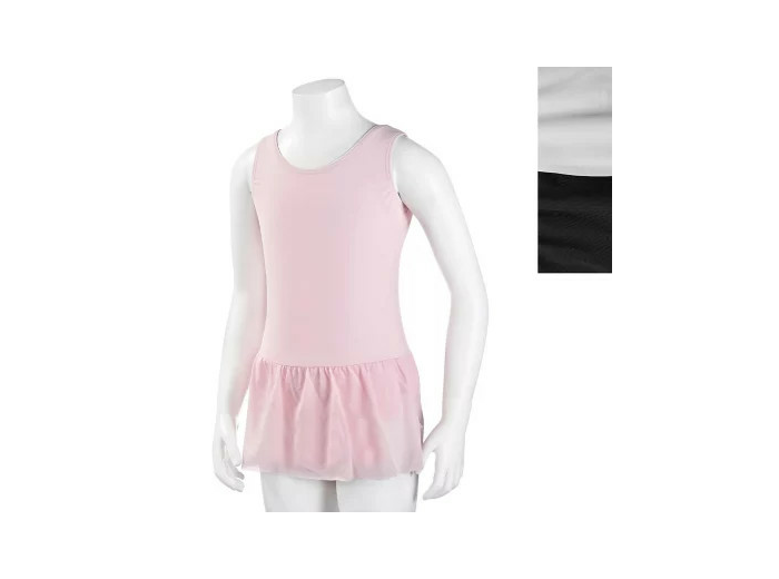 Justaucorps à jupette intégrée confortable et facile à enfiler. Tailles : du 4 au 12 ans.