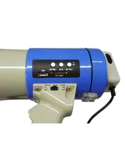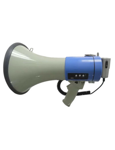 Mégaphone 60 watts avec avec lecteur USB/SD et sirène. Portée 600 mètres. Microphone amovible et bandoulière réglable. Alimentation : 8 piles LR14 (non fournies).