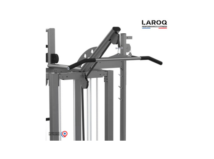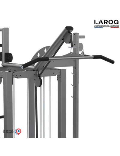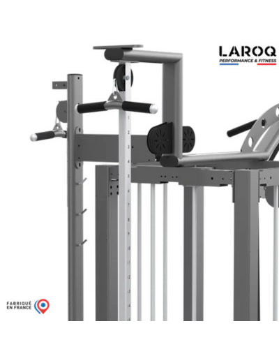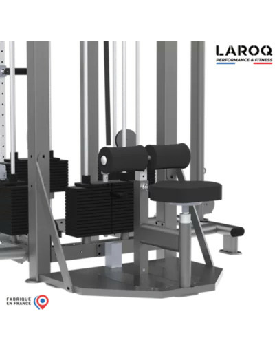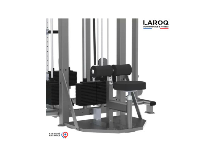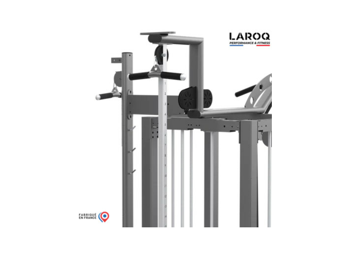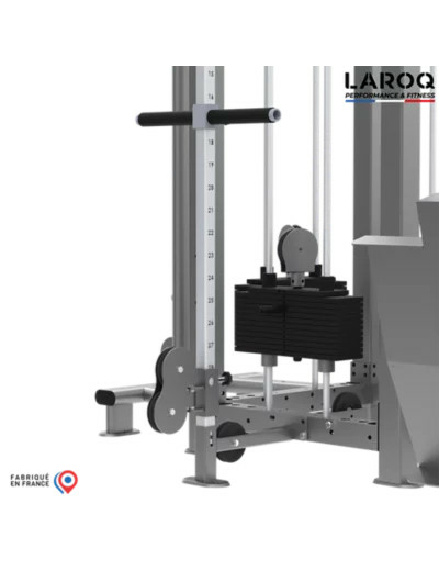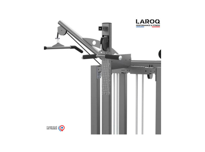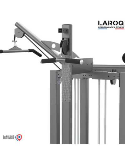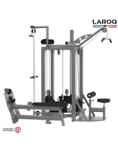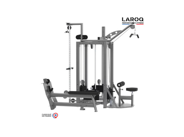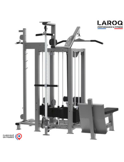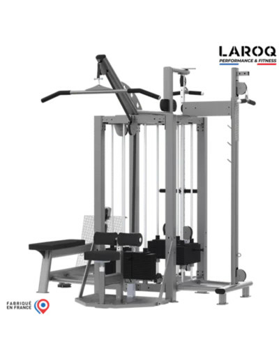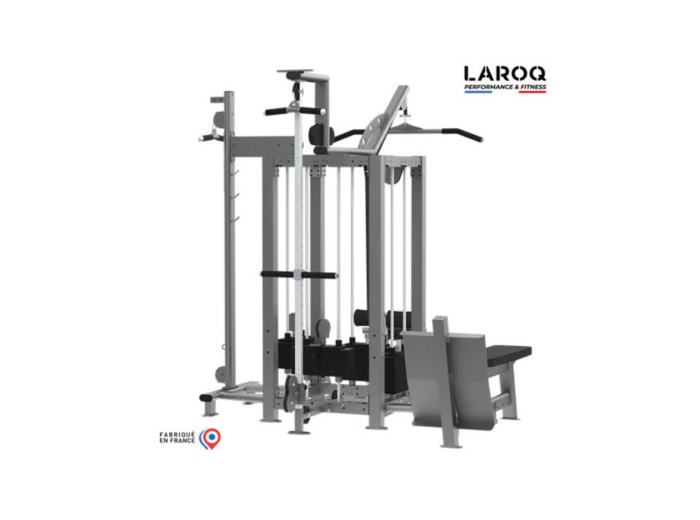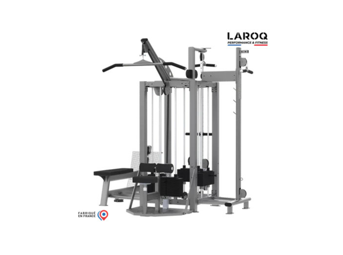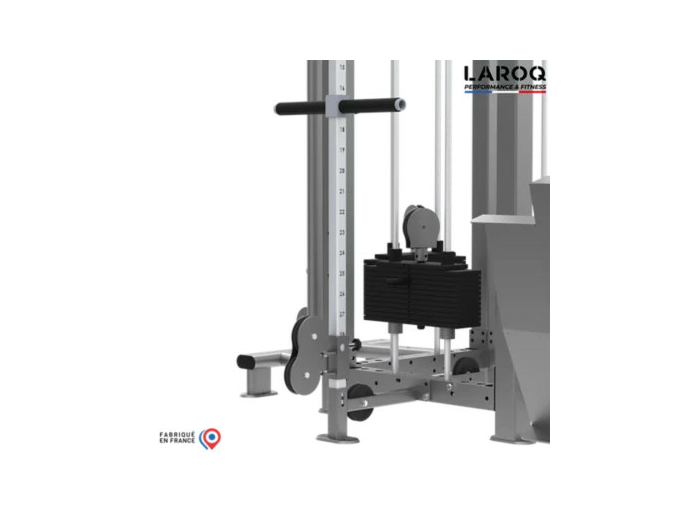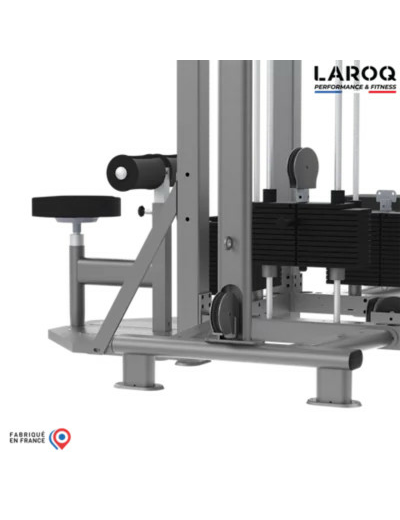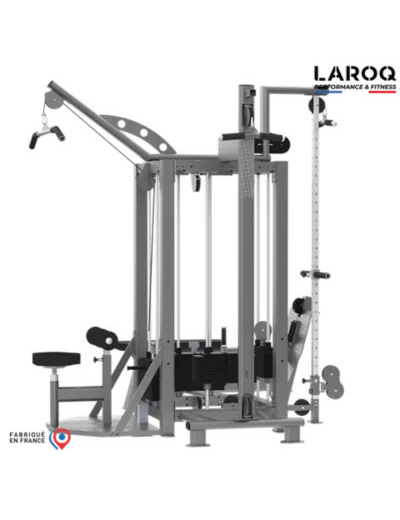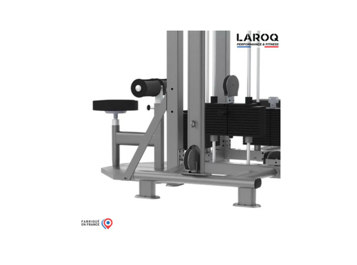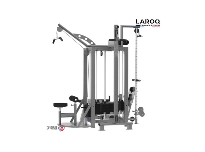 Travail des membres supérieurs et inférieurs en différentes positions. Peut accueillir jusqu’à 4 utilisateurs simultanés. Structure en tubes acier ovalisés de 3,2 mm d’épaisseur. Pictogrammes de mouvement et consignes de sécurité inscrits sur la machine. Poulie haute et basse : charge automatique de 60 kg, utilisable avec barre à triceps et poignées de tirage. "Dorsy" bas : charge automatique de 80 kg transmise par sangle haute résistance, utilisable avec double poignée de tirage ou guidon "rowing". Avec banc et repose-pieds incliné. "Dorsy" haut : charge automatique de 80 kg transmise par sangle haute résistance, blocage jambier, réglage du siège par vérin à gaz, utilisable avec barre de tirage large. Poulie réglable : charge automatique de 60 kg transmise par câble, avec 8 positions de réglage, utilisable avec barre à triceps et chevillière. Dimensions : 146,60 x 80 x 184,50 cm, 800 kg + 200 x 80 x 100 cm, 200 kg. Garantie : 5 ans. →Fiche Technique