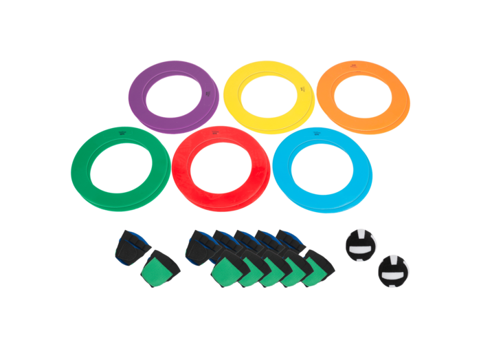 - 12 bases de différentes couleurs faisant office de buts.