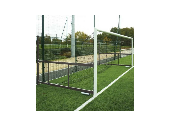Tube de section acier galvanisé ou aluminium plastifié blanc 102 mm, cadre arrière en acier galvanisé plastifié gris, pièces de jonction en aluminium moulées dans les angles de la façade, mâts arrières Ø80mm, fixation des filets par crochets nylon. Livrés sans fourreaux de scellement des mâts arrières. Buts conformes au code du sport et à la norme NF EN 748. Fourreaux en option (réf. FB040615).