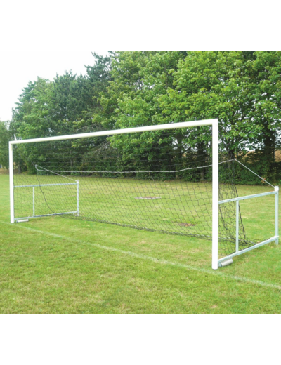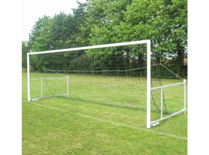 Tube de section acier galvanisé ou aluminium plastifié blanc 102 mm, cadre arrière en acier galvanisé à chaud, pièces de jonction en aluminium moulées dans les angles de façade, fixation des filets par crochets nylon. Livrés sans fourreaux de scellement des mâts arrières. Buts conformes au code du sport et à la norme NF EN 748. Fourreaux en option (réf. FB040633 ou FB040615).