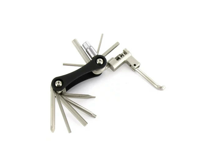 Outil 11 fonctions (dérive chaîne inclus) pour l’entretien des vélos, des trottinettes et des rollers. Grip caoutchouc pour un meilleur maintien et plus de confort. 11 fonctions : 1 dérive chaîne, 1 clé torx, 1 tournevis plat, 1 tournevis cruciforme, 7 clés Allen : 2 mm, 2,5 mm, 3 mm, 4 mm, 5 mm, 6 mm, 8 mm.