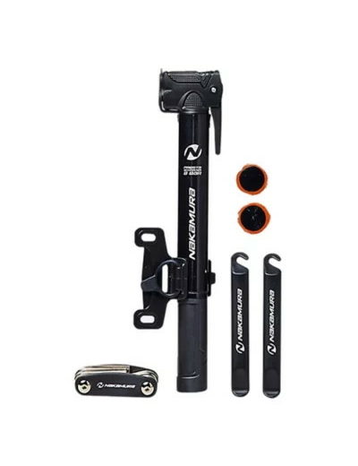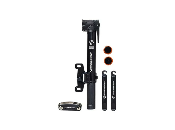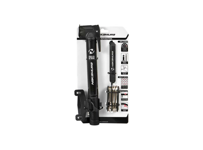 Le kit 0 souci. Emportez ce kit de prévention composé du juste nécessaire pour des sorties sans souci, en toute sérénité. Pompe double tête compatible Schrader/Presta. Outil de réparation 9 fonctions. 2 démonte-pneus. 6 patchs autocollants.