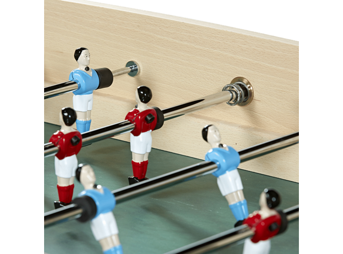 Le véritable baby-foot de café de fabrication française. Fabriqué en hêtre massif, ce baby-foot au design très sophistiqué fera le bonheur des amoureux du vrai baby-foot. Très haute stabilité grâce à ses pieds en hêtre massif. Barres télescopiques. Compteurs de points en métal. Palier de barre avec bague téflon. Ressorts intérieurs et extérieurs. Livré avec 2 balles en liège blanches. Dimensions extérieures : 153 x 105 x 95 cm. Poids : 76 kg.