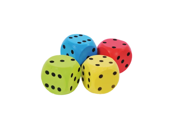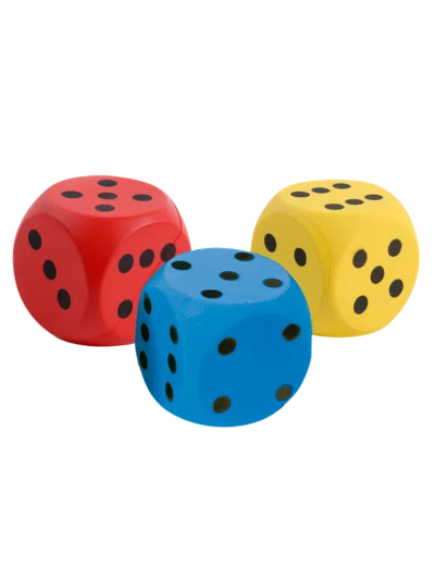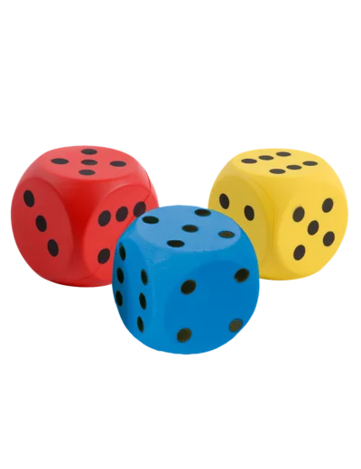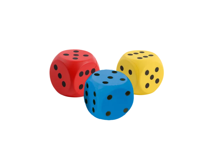 Dé en mousse polyuréthane brut. Numérotation des faces de 1 à 6. Disponible en 3 coloris (Jaune, Rouge, Bleu). Dimensions : 16x16x16cm. Poids : 155g.