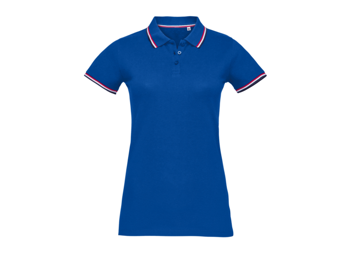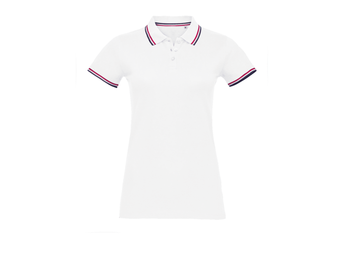 POLO FEMME 100% coton peigné Ringspun Col et bas de manche en bord côte 1x1 Bande de propreté tissée à l'intérieur du col Manches courtes Patte de boutonnage 3 boutons Coupé cousu Rayures contrastées au col, bas de manches, intérieur de fente côté et intérieur de col