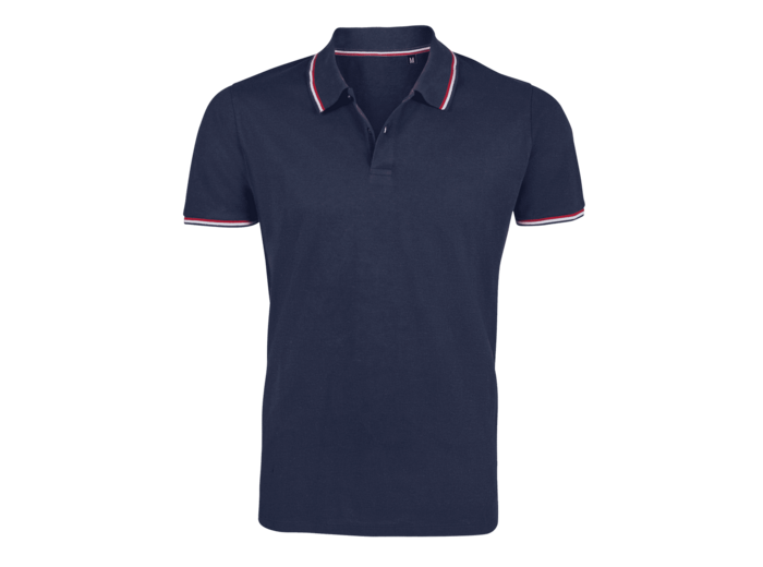 POLO HOMME 100% coton peigné Ringspun Col et bas de manche en côte 1x1 Bande de propreté tissée à l'intérieur du col Manches courtes Patte de boutonnage 2 boutons Coupé cousu Rayures contrastées au col, bas de manches, intérieur de fente côté et intérieur de col