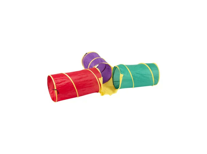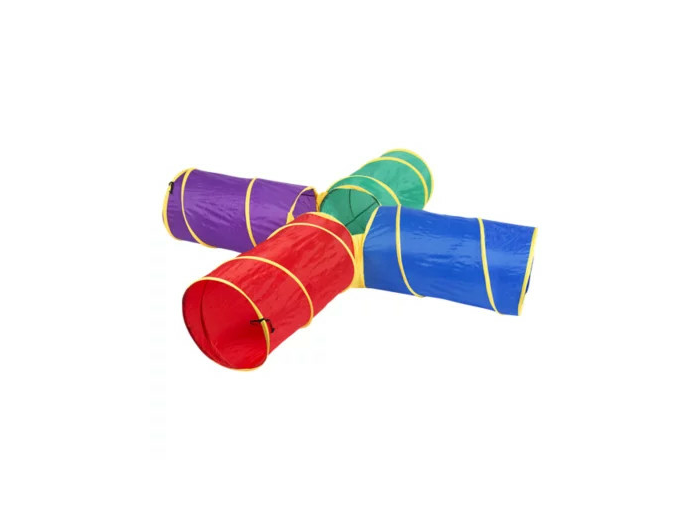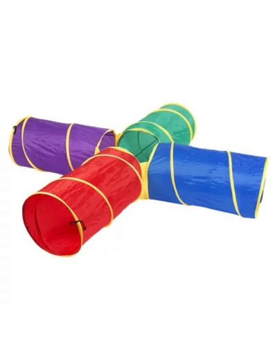 Kit de 4 tunnels reliés par une connexion centrale avec ouverture. Longueur de chaque tunnel : 1 m. Diamètre : 51 cm. Livré dans un sac de transport.
