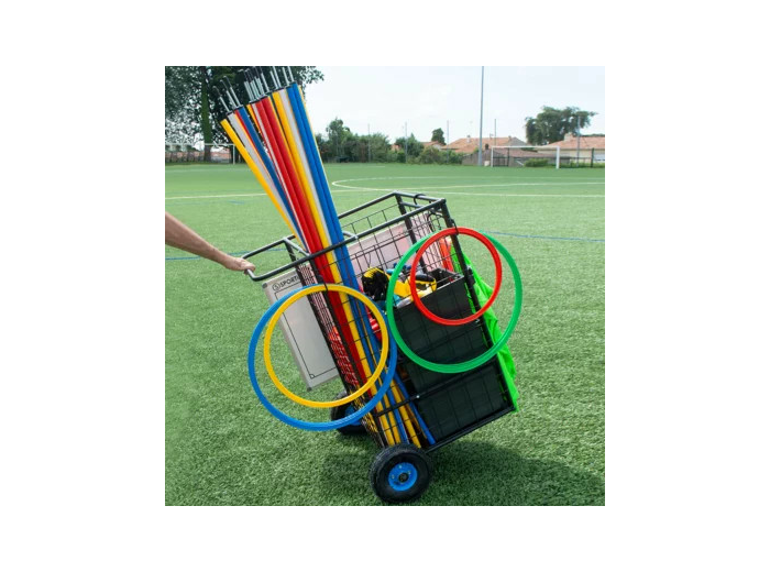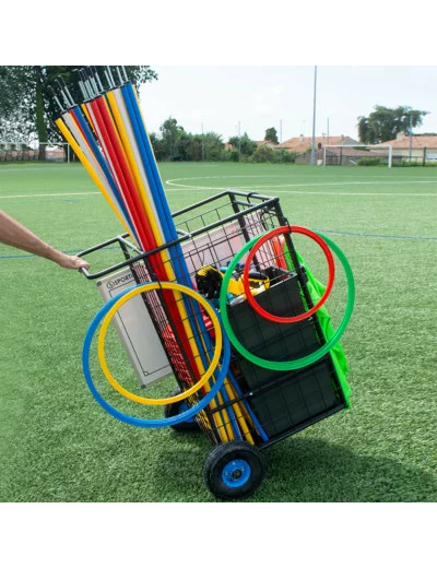 Que ce soit pour le transport de ballons ou de matériel, ce chariot sera le partenaire idéal de vos entraînements. Très maniable et très pratique avec sa porte avant et ses roues surdimensionnées, vous n’aurez aucun mal à le faire rouler, même sur terrain gras. Livré démonté. Emplacement de rangement des grandes longueurs (jalons/piquets de slalom), fermeture de la porte sécurisée pendant le transport.