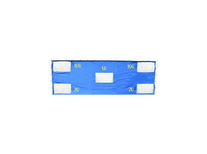 Cible pour but de football en bâche polyester enduite très résistance pour le travail de la précision. Comporte 5 cibles numérotées avec filet derrière chaque cible pour faciliter la récupération du ballon. Ce fixe avec 22 sandows fournis. Dimensions d'une cible : Longueur 100cm, hauteur 60cm. Dimensions de la bâche : Longueur 500cm, hauteur 200cm.