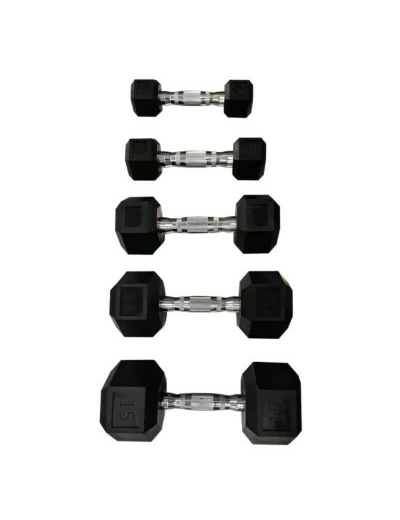 Dumbell ou haltère hexagonale en PVC avec poignée antiglisse en acier chromé. Leur forme hexagonale évite les roulis au sol. Vendue à l’unité. Disponible en 5 poids différents : 6kg (ref.044136), 8kg (ref.044137), 10kg (ref.044138), 12,5kg (ref.044139), 15kg (ref.044140).
