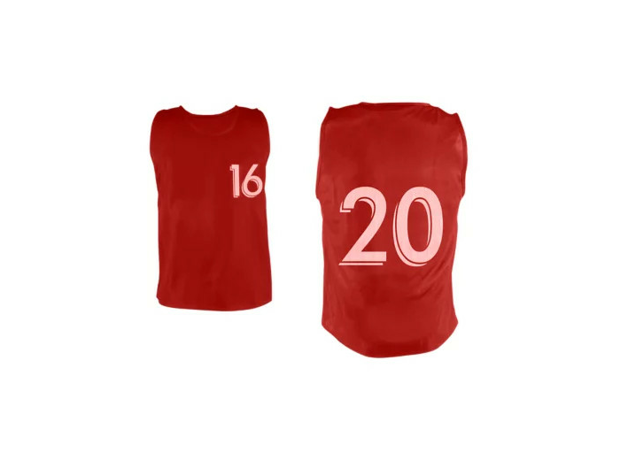 Chasubles extensibles et agréables au toucher, 100% polyester. Vendus en lot de 10 numérotés de de 16 à 20. Numéros coeur et dos. Disponibles en 3 tailles (XS H.56xL.48cm, M H.66xL.55cm et XL H.76xL.60cm) et en 4 couleurs (Bleu, Jaune, Rouge et Vert).