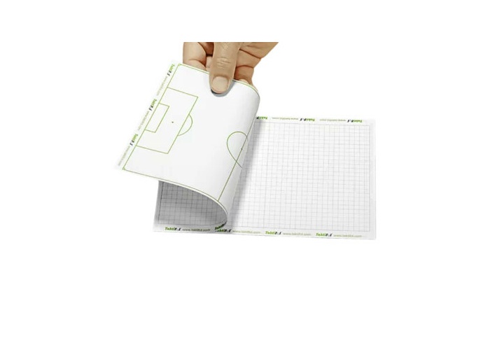 Bloc-notes football 148x210 mm composé de 25 feuilles en papier avec imprimé : motif damier au recto, terrain de jeu au verso. S'intègre parfaitement dans la poche de la housse de transport Taktifol (ref.063305).