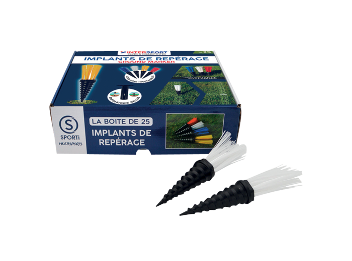 Boîte de 25 + enfonçoir. Implants d’herbe en fibre synthétique pour la signalisation et le repérage d’une ligne ou d’une zone de façon ponctuelle ou permanente. Facile à poser grâce à son enfonçoir, vous pouvez en fonction du terrain, soit le visser si le terrain est souple ou s’aider d’un marteau si le terrain est plus dur. 4 coloris disponibles : blanc, jaune, bleu et rouge. Livré par boîte de 25 implants de la même couleur et d’un outil enfonçoir de pose.