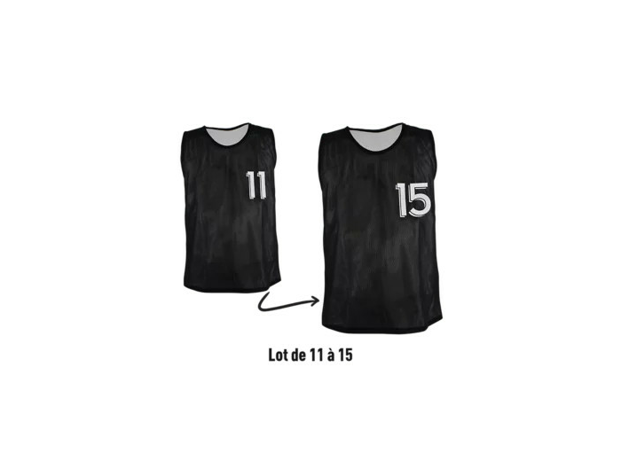 Chasuble réversible d’entraînement avec mailles ajourées pour encore plus de respirabilité. 100% polyester. Numérotés de 1 à 10 ou de 11 à 15. Tailles : Mini kids (2XS) : L. 48 x l. 40 cm. Kids (XS) : L. 56 x l. 48 cm. Junior (M) : L. 66 x l. 55 cm. Adulte (XL) : L. 76 x l. 60 cm.