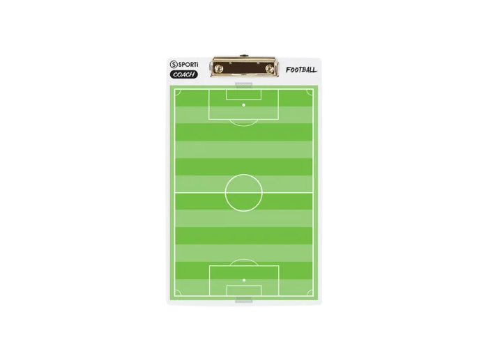 Planche effaçable rigide en PVC avec pince métallique, une face avec terrain en entier et une face avec un demi terrain avec vue immersive. Livré avec un crayon effacable sous packaging individuel facile à mettre en rayon. L.36cm x l.22,5cm. Existe en 5 versions de sport différents : Basketball, Football, Handball, Rugby et Volleyball.