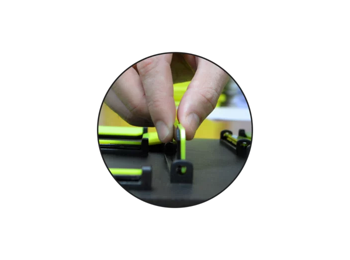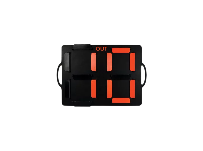 Système de changement de joueurs recto-verso. Numérotation possible de 00 à 99 sur chaque face à l’aide de palettes réversibles noires/jaunes ou noires/oranges. Coloris fluos pour plus de visibilité. Dimensions de l'ensemble : L.40 x H.31cm. Dimensions 1 chiffre : L.14 x H.27cm.