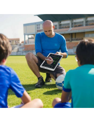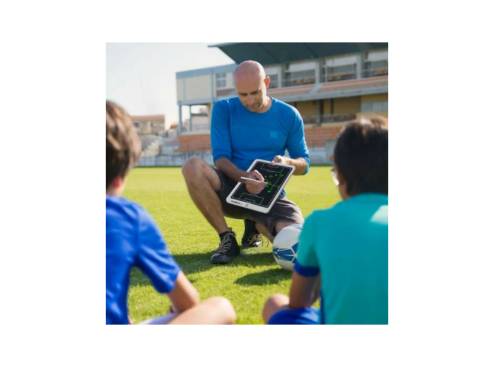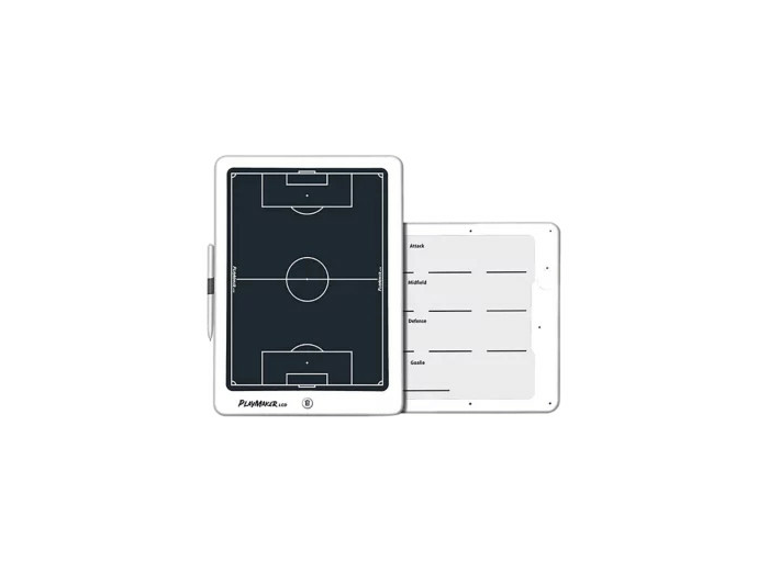 Cette tablette est équipée d’un écran LCD offrant une surface d’écriture très nette et lumineuse. Une fonction « d’effaçage instantanée » vous permettra d’effacer votre tablette en appuyant simplement sur un bouton et un autre bouton vous permettra de verrouiller ou déverrouiller l’écran. La tablette comprend également au dos, un tableau blanc effaçable à sec pour vos compositions d’équipe. Livré avec un stylet d’écriture et son manuel d’utilisation. Disponible en 2 formats : 14’’ L.32,5 x l.23,5cm avec une surface d'écriture de 20x27,5cm, fonctionne avec une pile incluse CR2025 et 20’' L.47 x l.32cm avec une surface d'écriture de 27,5x38,5cm, fonctionne avec 2 piles incluses CR2032. Existe en 5 sports différents (selon le format) : Basketball, Football, Handball, Futsal, Rugby et Volleyball.