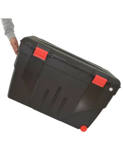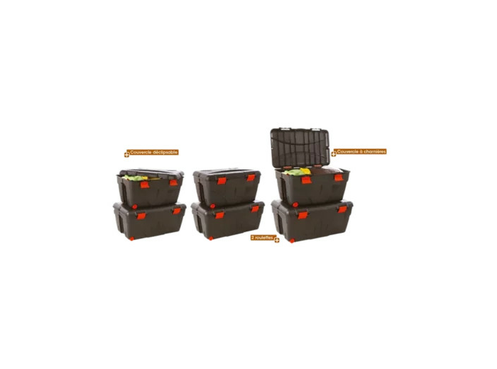 En polypropylène avec 2 roulettes et couvercle déclipsable.
