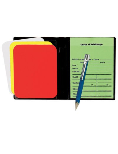 Contient 1 carton rouge, 1 carton jaune, 1 carton blanc, 1 carte d'arbitrage et 1 crayon.