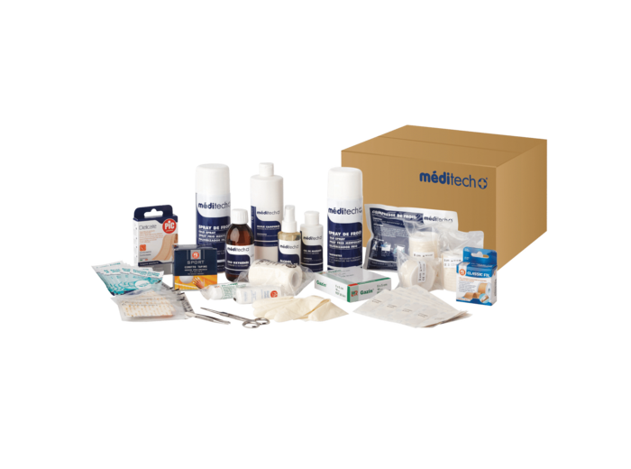 Sac contenant : 1 paire de ciseaux, 1 pince à épiler, 1 sparadrap, 2 bandes extensibles, 2 bandes de gaze, 2 lots de 10 tampons imbibés d'alcool, 1 lot de 10 compresses, 2 paires de gants, 2 jeux de 10 pansements, 1 pansement à découper, 1 lot de 5 sachets de 3 sutures, 2 compresses de froid, 1 bande autofixante, 2 bombes de froid, 1 spray alcool 70°, 1 huile camphrée, 1 eau oxygénée, 1 gel de massage arnica et menthol, 1 bande adhésive élastique (2,5 m x 3 cm), 2 bandes adhésives élastiques (2,5 m x 6 cm), 1 bande adhésive élastique (2,5 m x 8 cm), et 2 sparadraps pour strapping.