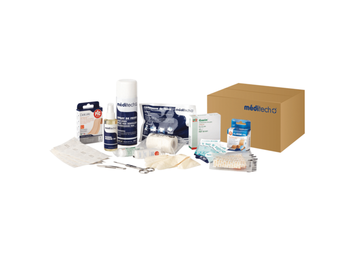 Sac contenant : 1 paire de ciseaux, 1 pince à épiler, 1 sparadrap, 1 bande extensible, 1 bande de gaze, 10 tampons imbibés d'alcool, 1 lot de 10 compresses, 1 paire de gants, 1 jeu de 10 pansements, 1 lot de 5 sachets de 3 sutures, 1 pansement extensible, 1 compresse de froid, 1 bande autofixante, 1 bombe de froid, et 1 spray alcool 70°. Dimensions : 38 x 24 x 24 cm.