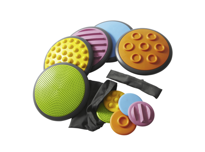 Ce jeu consiste à se déplacer les yeux bandés sur des plateformes en associant les formes ressenties sous les pieds avec les formes tenues dans la main. Comprend :