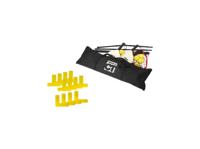 Kit comprenant : poteaux métalliques, filet longueur 6m - maille 19mm, 4 raquettes en bois, 6 balles, 8 marquages T, 4 marquages L, permettant de délimiter le terrain et une housse de transport.